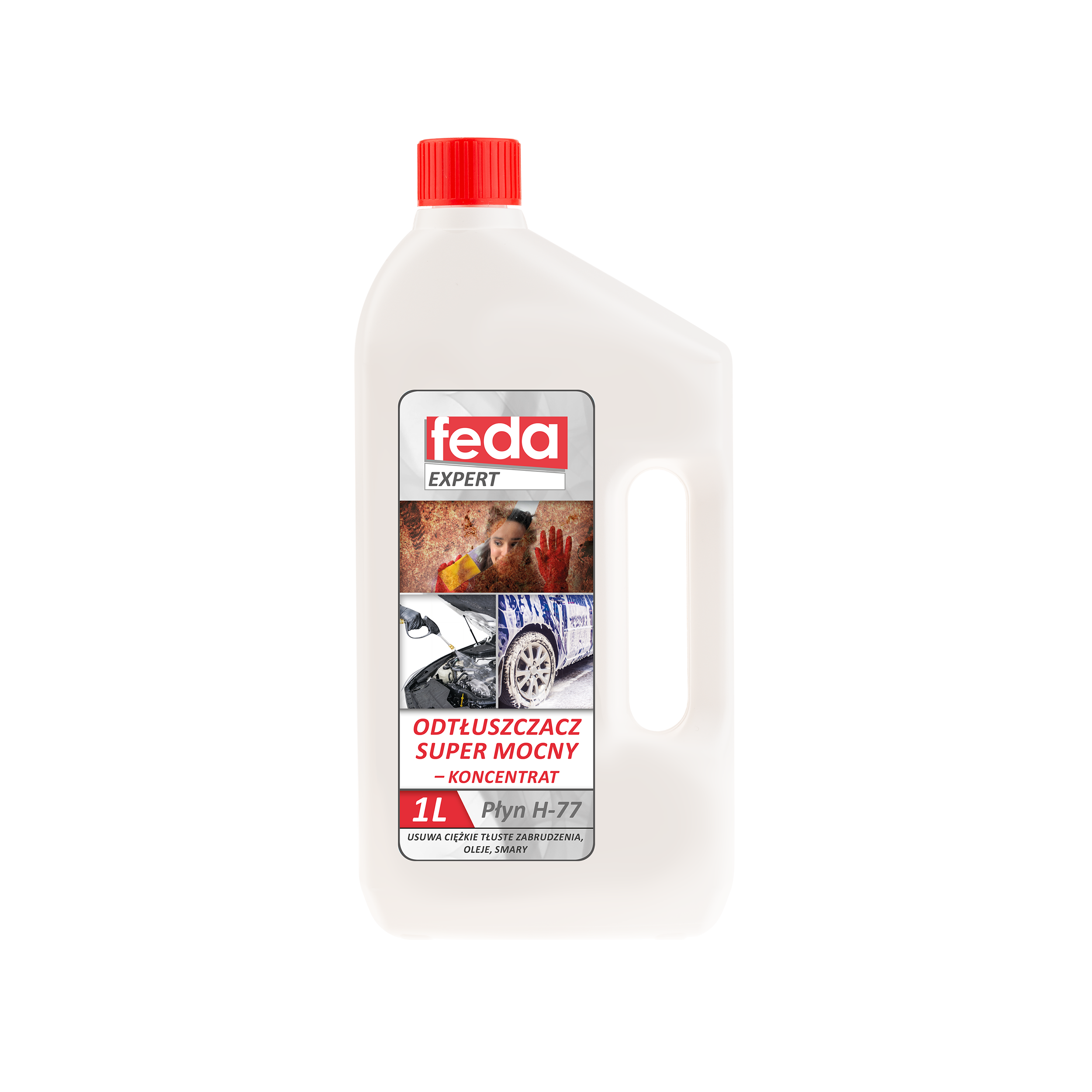 Feda Expert H-77 w postaci koncentratu przeznaczony do mycia uciążliwych zbrudzeń różnego pochodzenia powierzchni: sprzętu gospodarstwa domowego, wyciągów wentylacyjnych, zewnętrznych części silnika, części mechanicznych, samochodów i felg samochodowych oraz innych powierzchni zmywalnych odpornych na wilgoć .