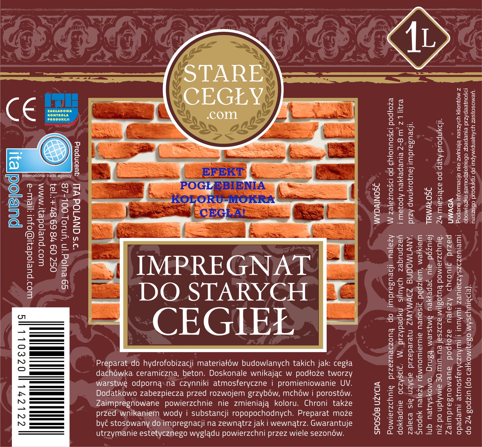 Środek dedykowany do hydrofobizacji materiałów budowlanych, zwłaszcza starej cegły oraz płytek ze starej cegły. Można stosować również do: dachówki ceramicznej, cegły, betonu. Głęboko penetrując podłoże, tworzy warstwę chroniącą przed czynnikami atmosferycznymi i promieniowaniem UV. Ponadto zabezpiecza przed powstawaniem grzybów, mchów i porostów. Powierzchnie zaimpregnowane preparatem nie zmieniają koloru. Zabezpiecza także przed wnikaniem wody oraz substancji ropopochodnych wgłąb podłoża. Środek jest skuteczny zarówno na zewnątrz jak i wewnątrz. Zapewnia utrzymanie estetycznego wyglądu i podkreśla barwę powierzchni przez wiele sezonów. Tworzy efekt pogłębienia koloru, tzw. "mokra cegła".