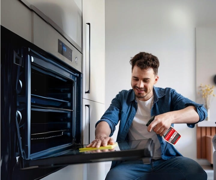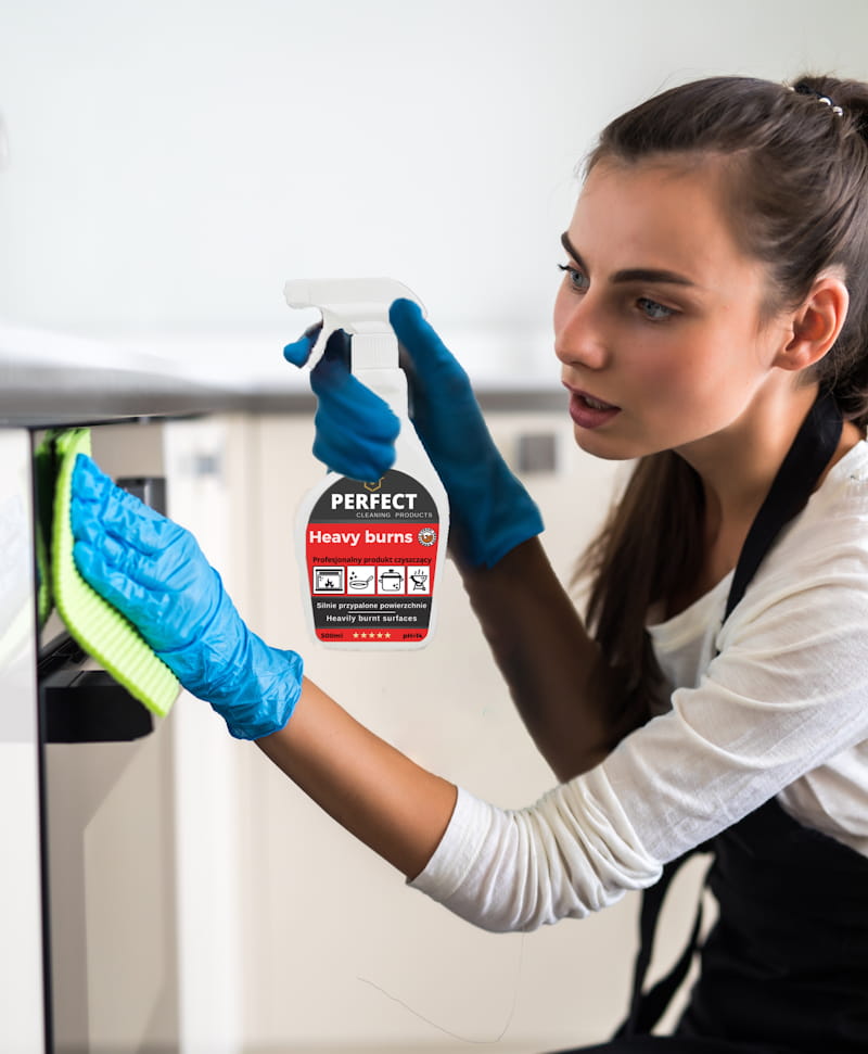 Nałożyć substancję na przypaloną powierzchni i pozostawić ją przez kilka minut aby zadziałała. W przypadku przypalonego tłuszczu dodatkowo przetrzeć to miejsce gąbką. Dokładnie spłucz preparat czystą wodą i wytrzyj do sucha.
