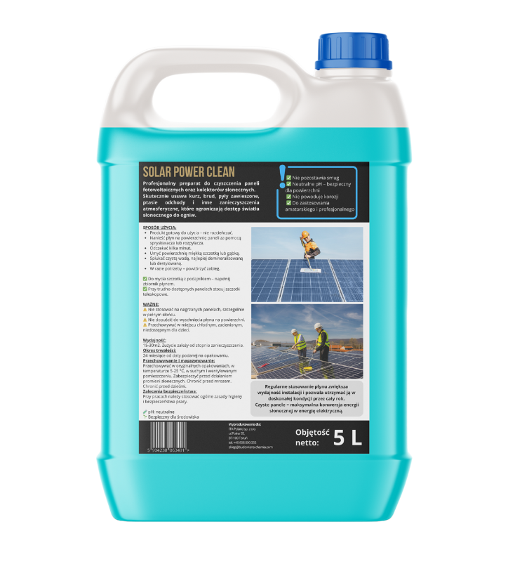 Płyn do mycia paneli fotowoltaicznych SOLAR POWER CLEAN to skuteczny, ekologiczny i gotowy do użycia środek czyszczący, stworzony z myślą o użytkownikach instalacji PV. Doskonale usuwa zanieczyszczenia atmosferyczne, takie jak kurz, pyłki, piasek, sadza, smog czy ptasie odchody, które zmniejszają sprawność instalacji nawet o 20%.Dzięki specjalnej formule nasz płyn czyści bezpiecznie i bez smug, nie naruszając powłoki paneli solarnych. To idealny wybór zarówno dla gospodarstw domowych, jak i firm z instalacjami PV.